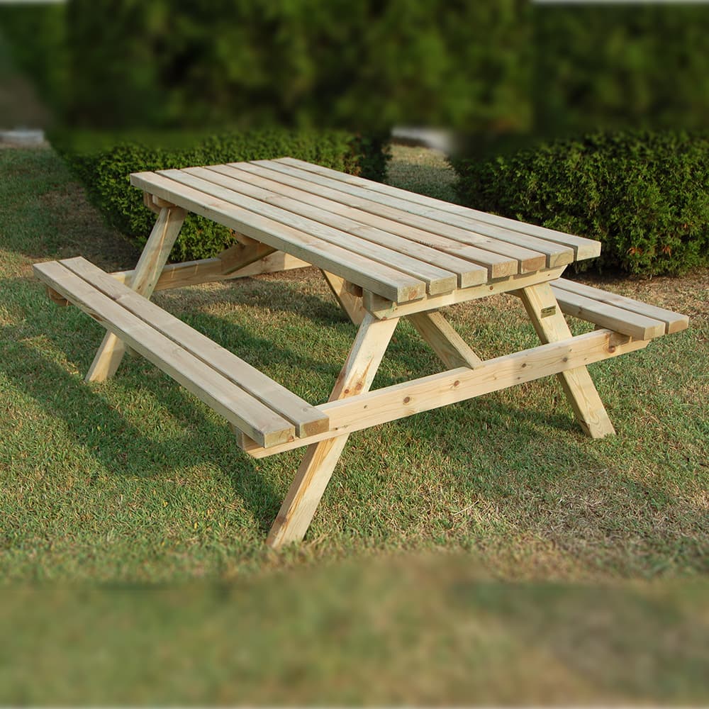 Tavolo Picnic 180 x 150 cm realizzato con tavole da 40 mm, spessore tavole seduta mm 30, panche fisse, n. 6 posti, in legno di pino impregnato, ideale per creare aree pic nic in parchi pubblici, aree gioco, aree sosta attrezzate. Perfetto per i ristoranti all’aperto.